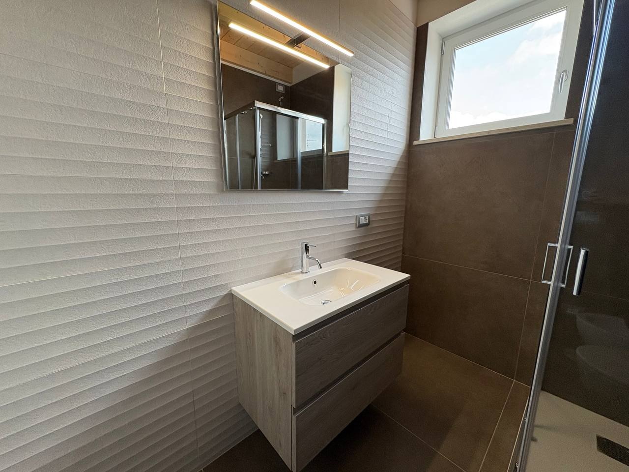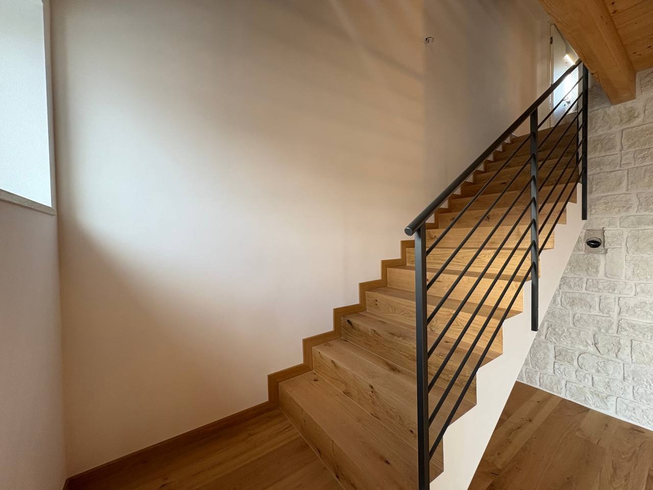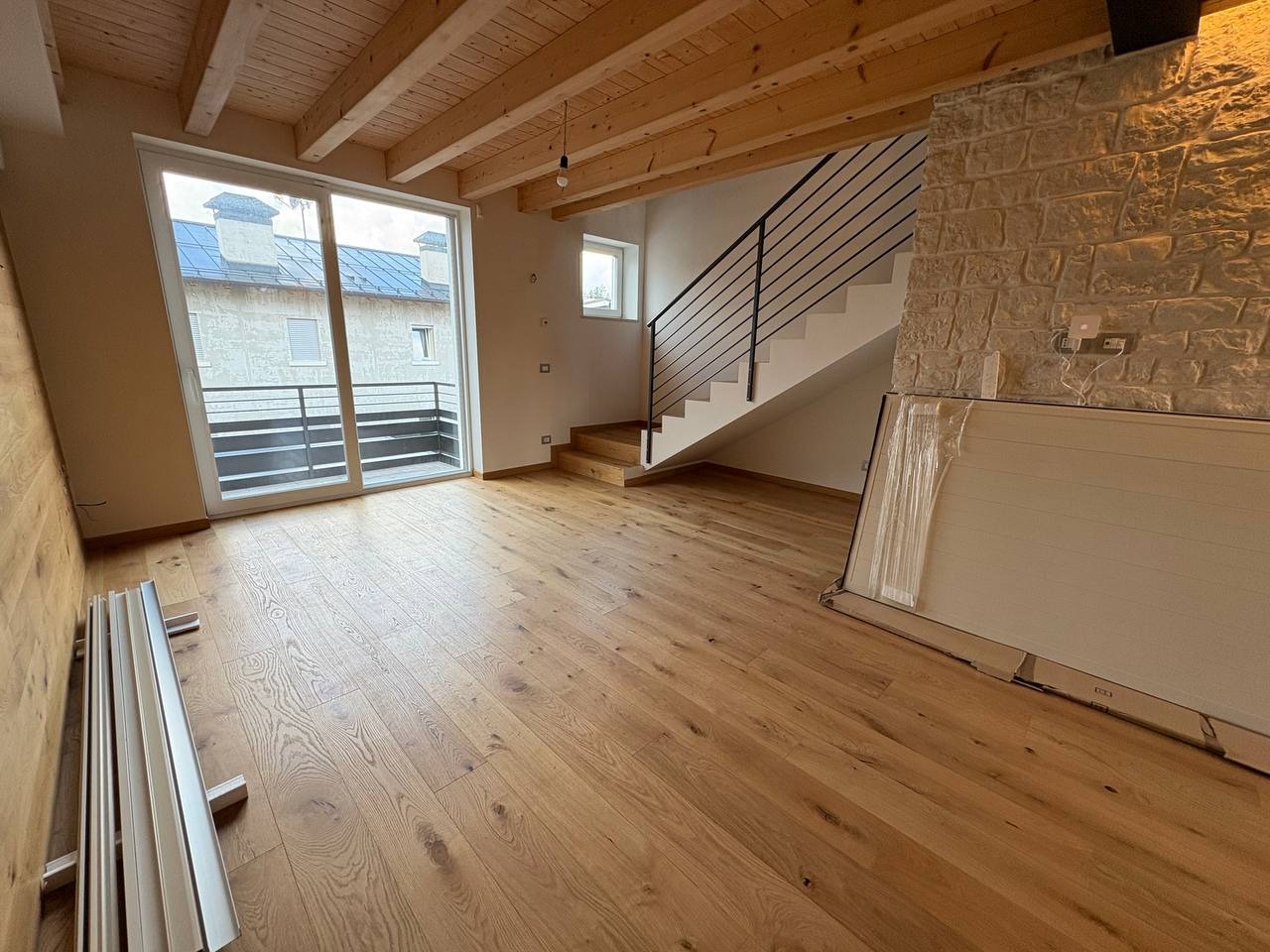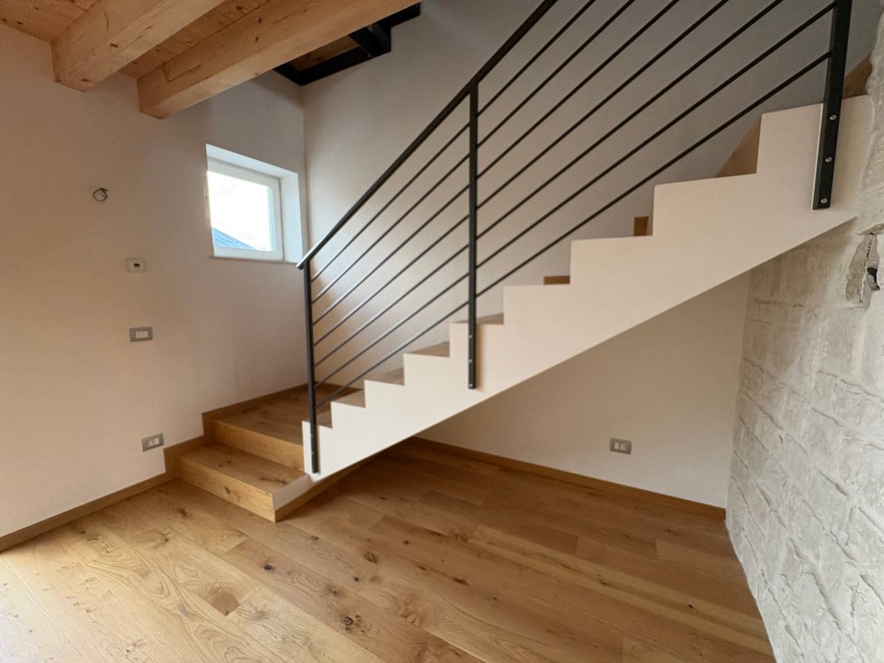 Al piano primo, l’ingresso con portoncino blindato si apre su una luminosa zona giorno open space, impreziosita da grandi vetrate che donano luce naturale per tutta la giornata. Il soggiorno è dotato di ripostiglio, bagno finestrato con box doccia, predisposizione per caminetto o stufa a pellet e accesso a un terrazzino ben esposto, ideale per momenti di relax all’aperto.