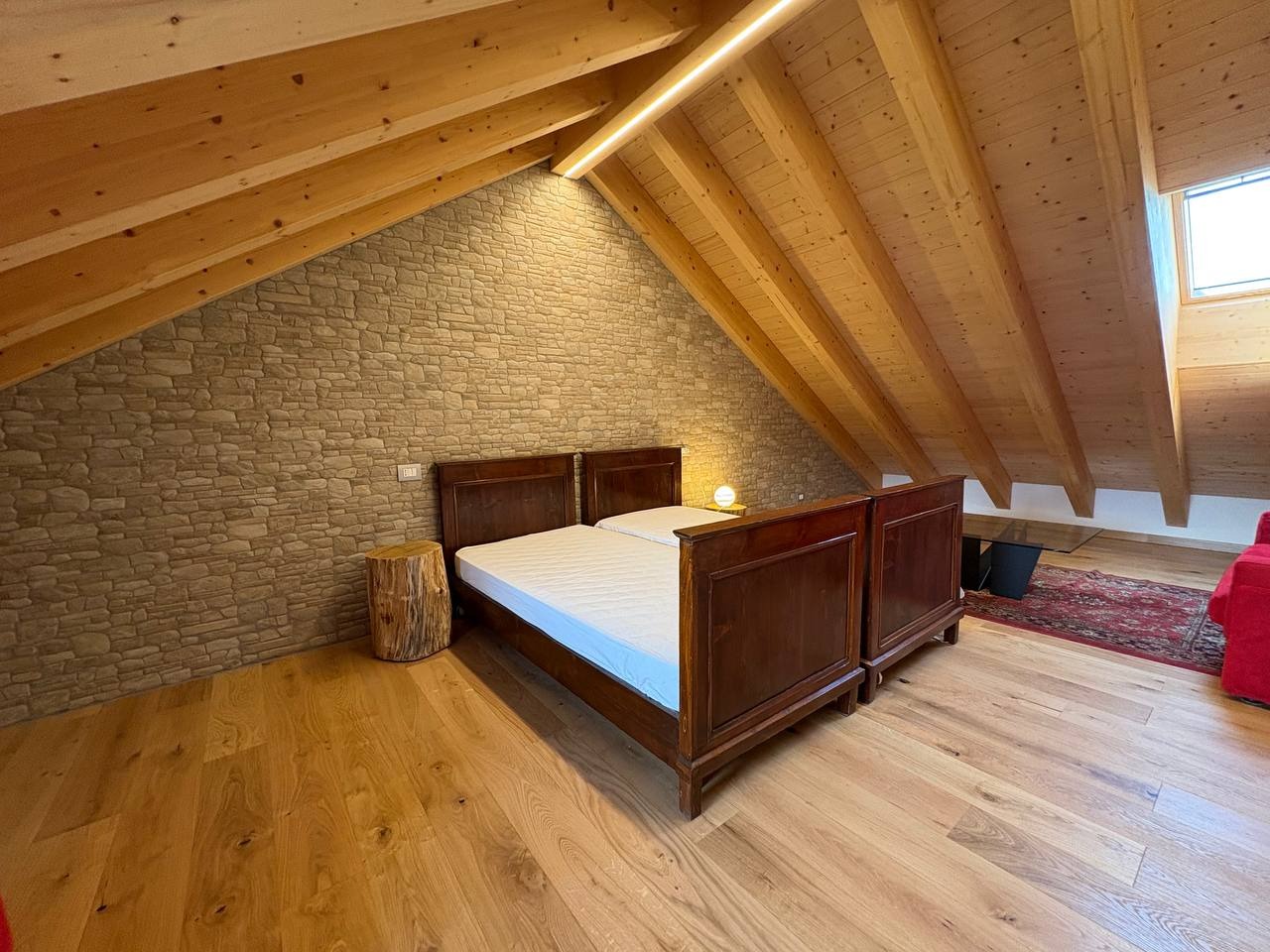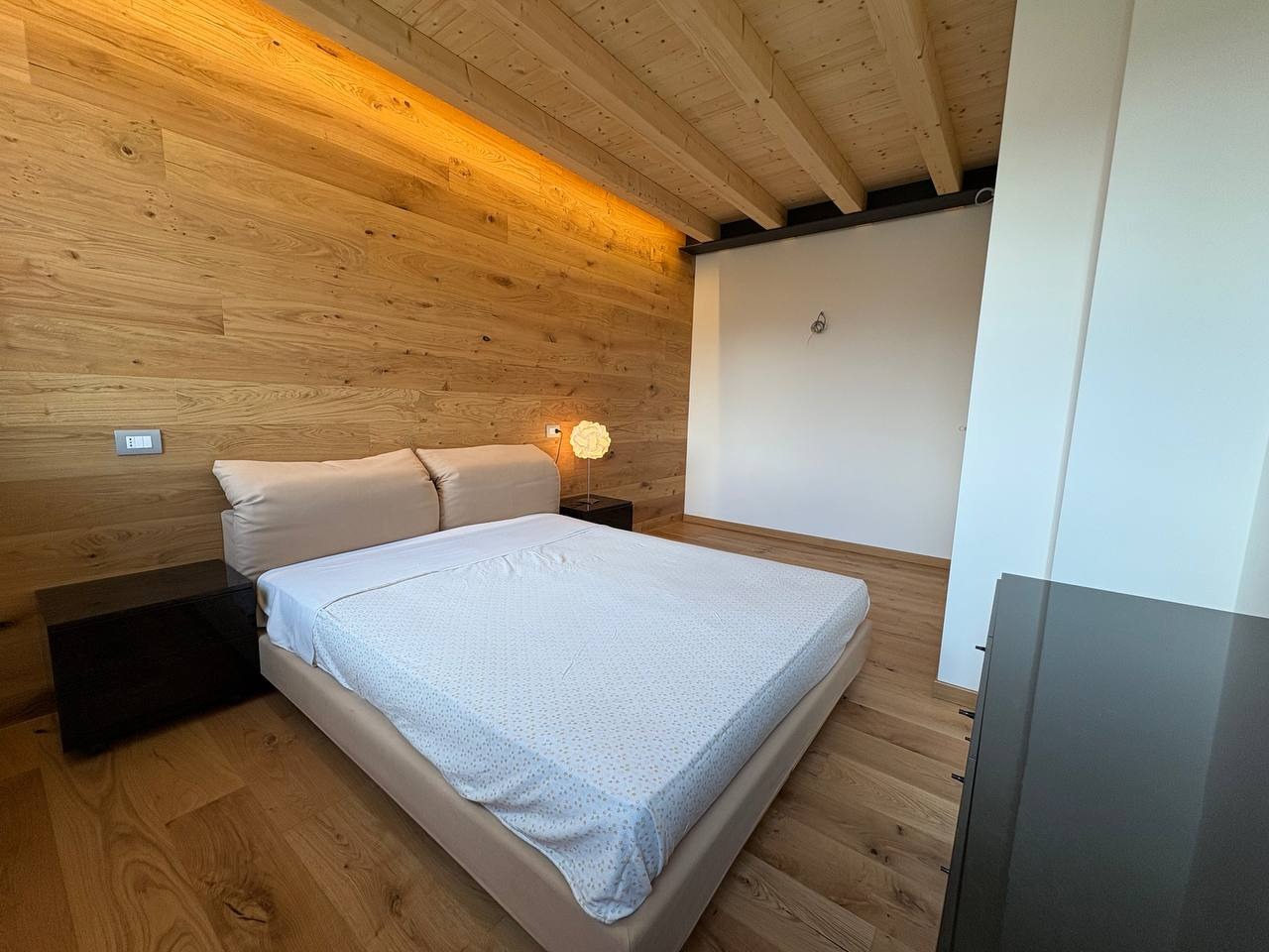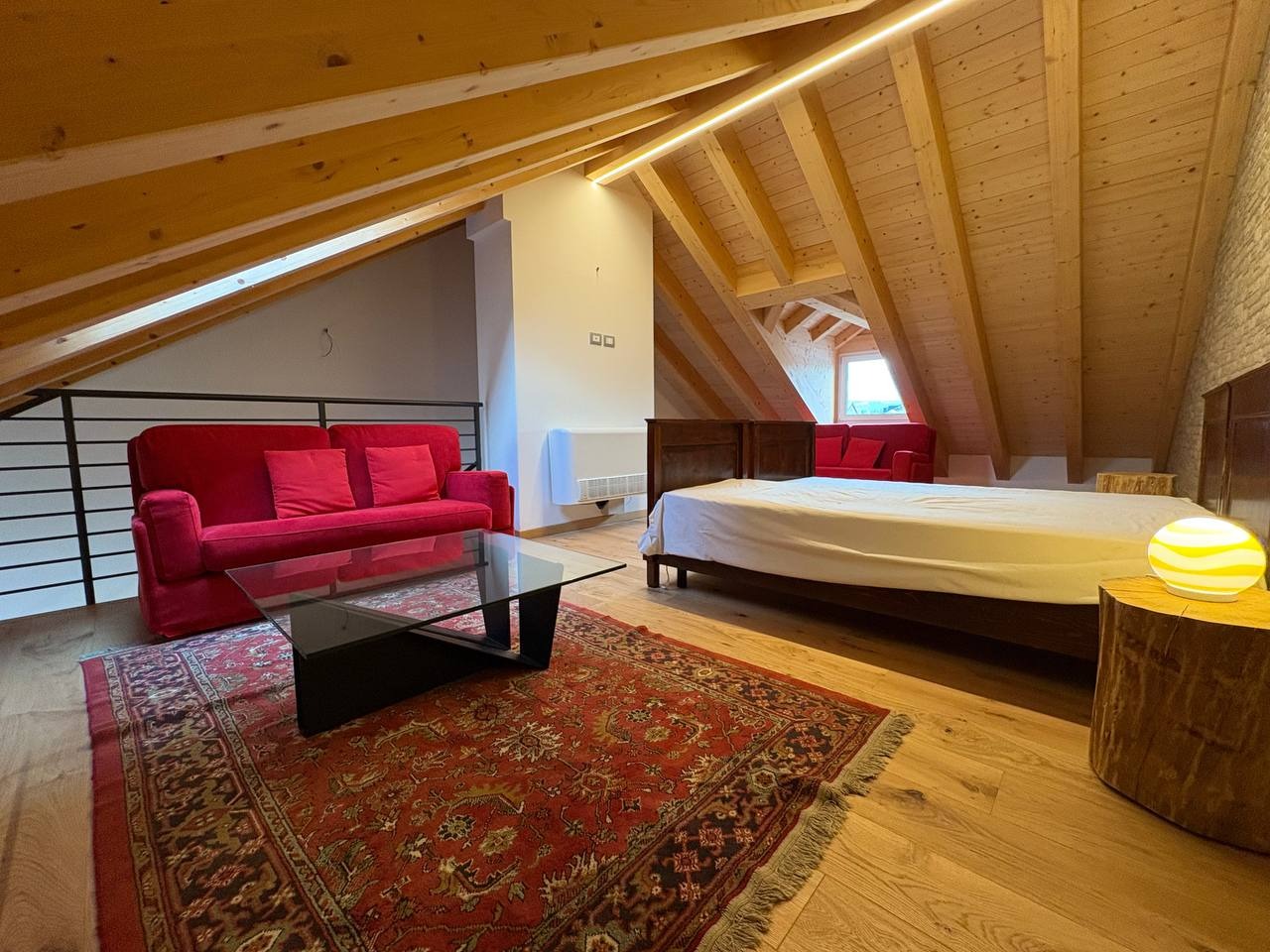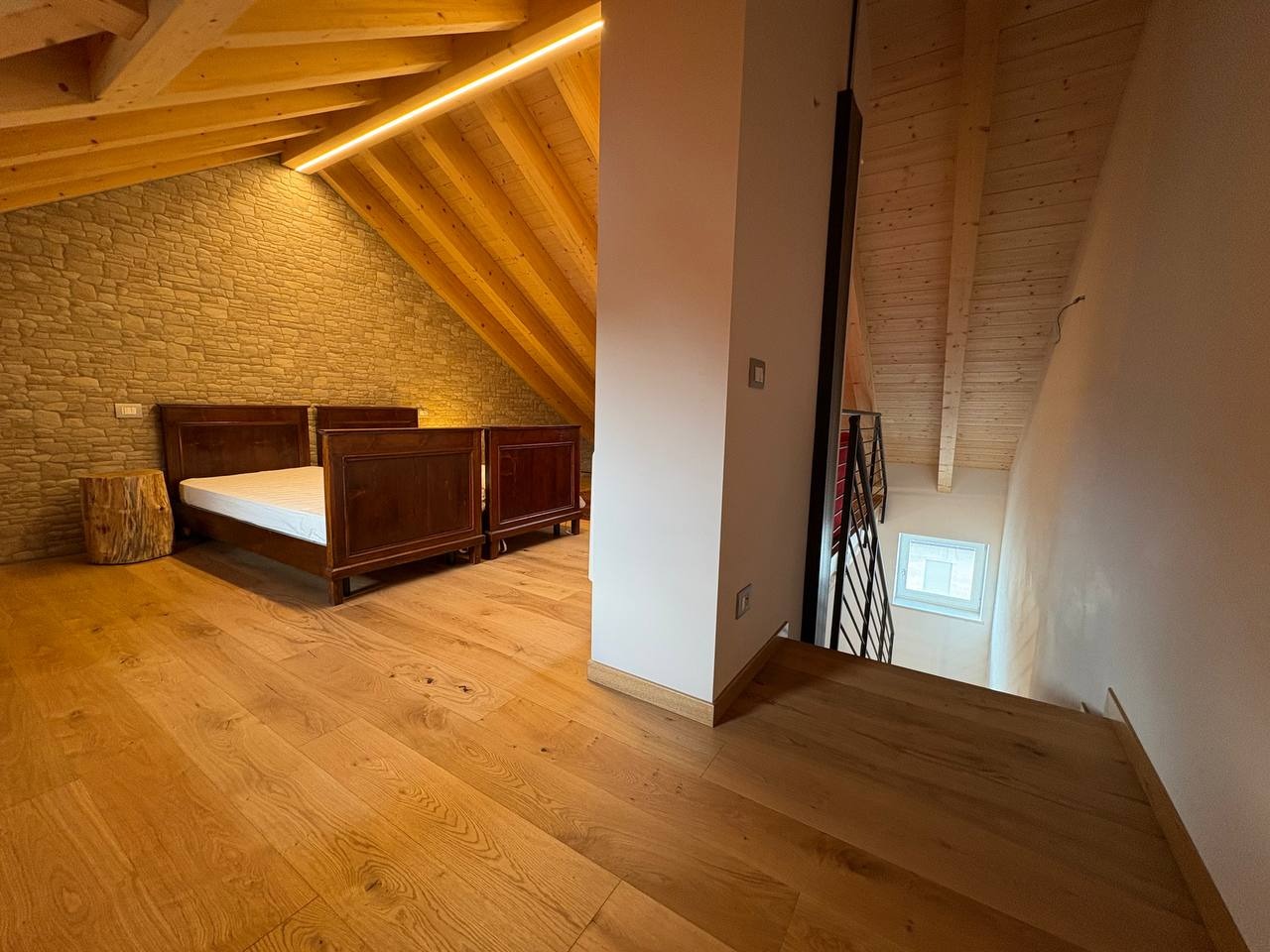 Al livello superiore, nel sottotetto con travi a vista in legno, è presente una terza camera matrimoniale dallo stile caldo e contemporaneo, valorizzata da illuminazione a strisce LED che dona carattere e atmosfera. Questa stanza può essere eventualmente adibita ad un salottino o camera hobby.