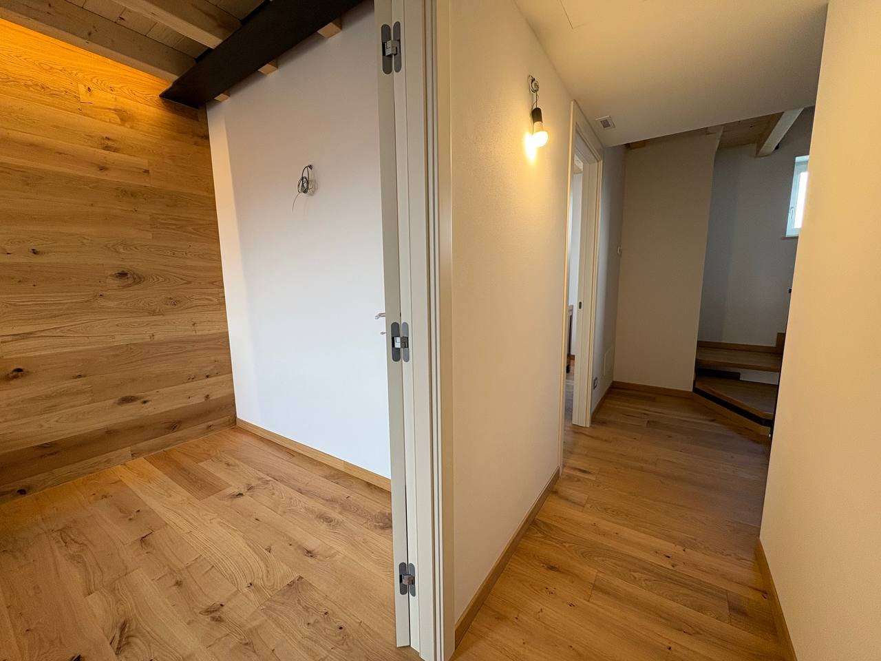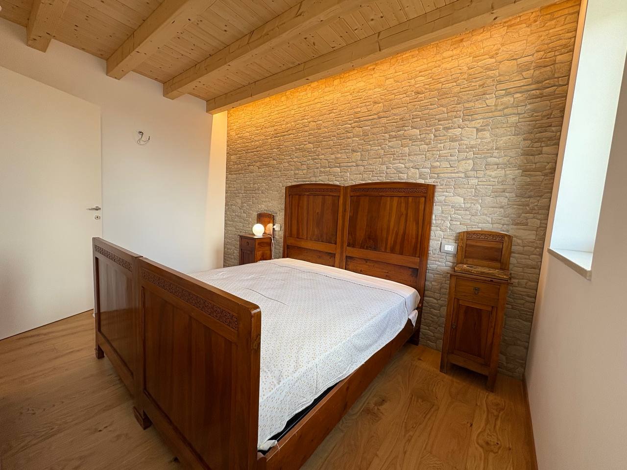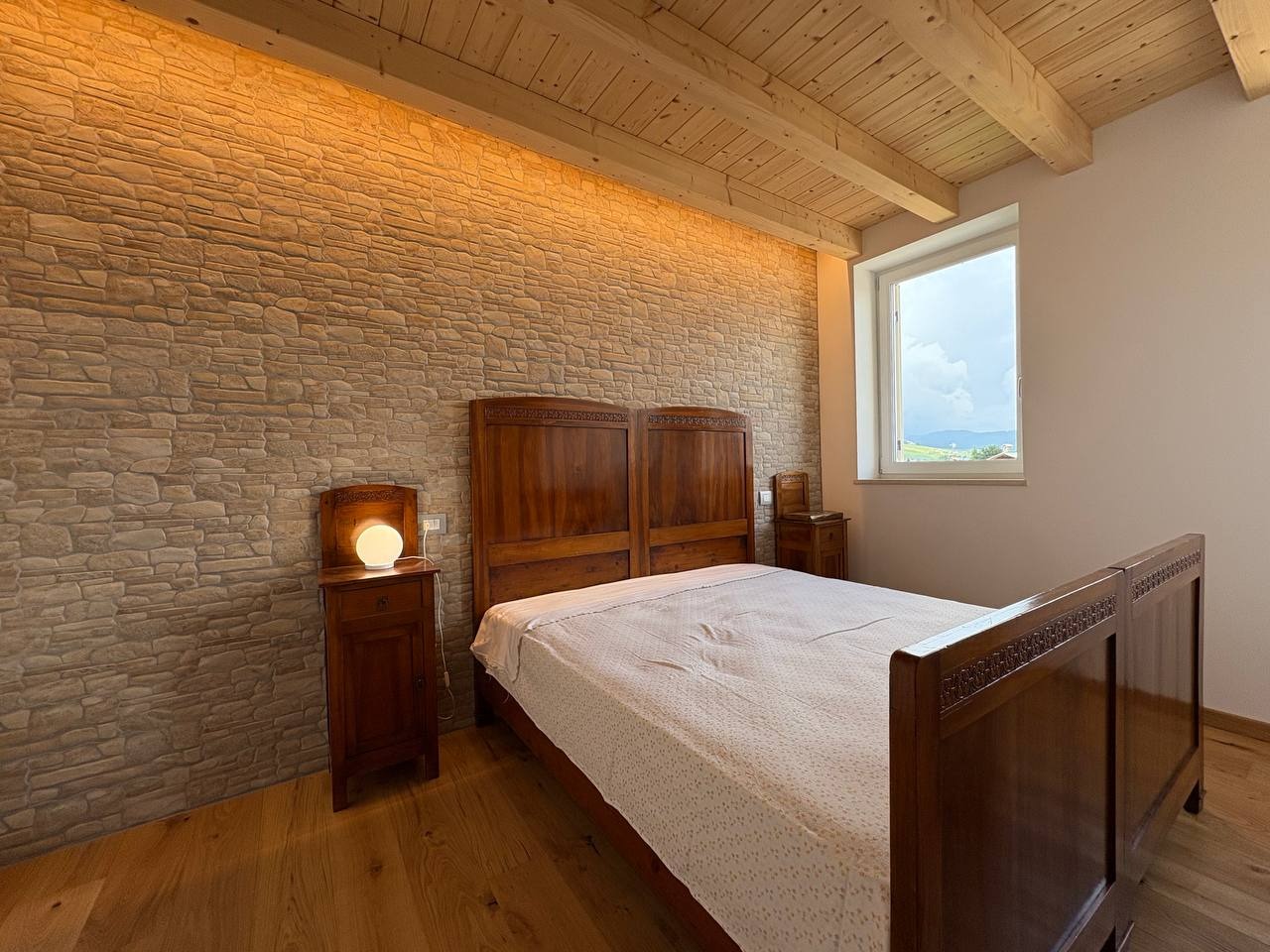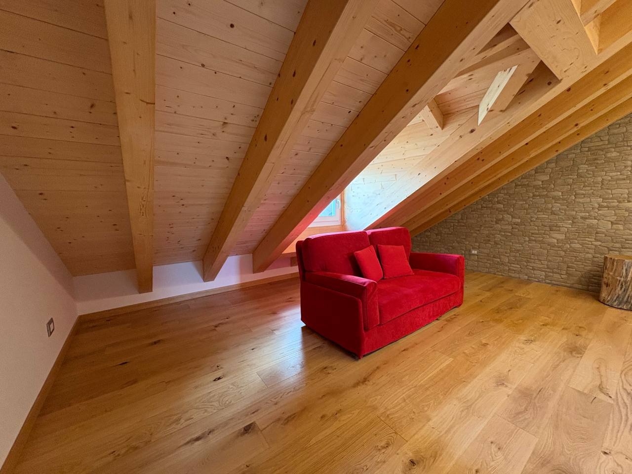 Al livello superiore, nel sottotetto con travi a vista in legno, è presente una terza camera matrimoniale dallo stile caldo e contemporaneo, valorizzata da illuminazione a strisce LED che dona carattere e atmosfera. Questa stanza può essere eventualmente adibita ad un salottino o camera hobby.