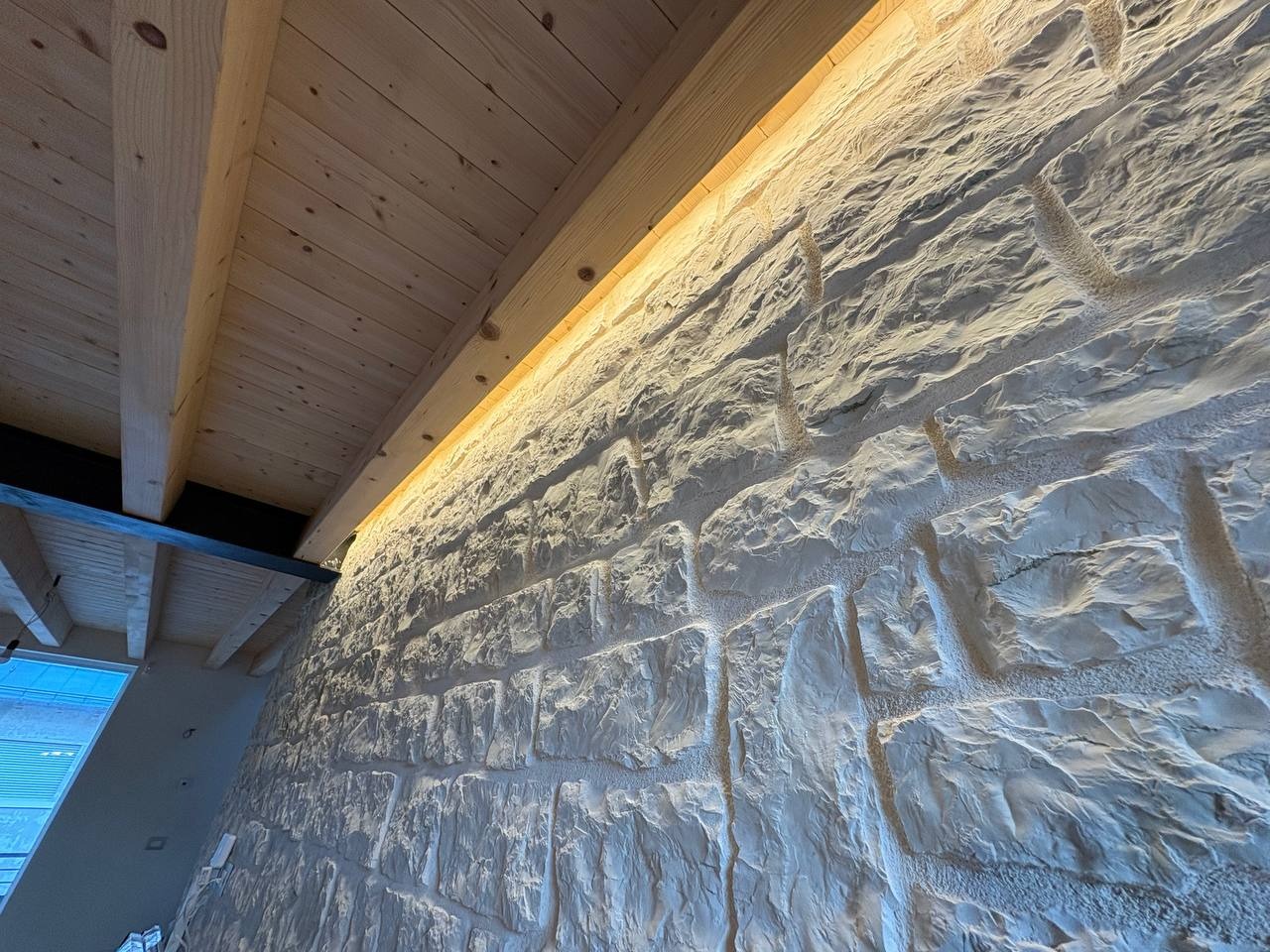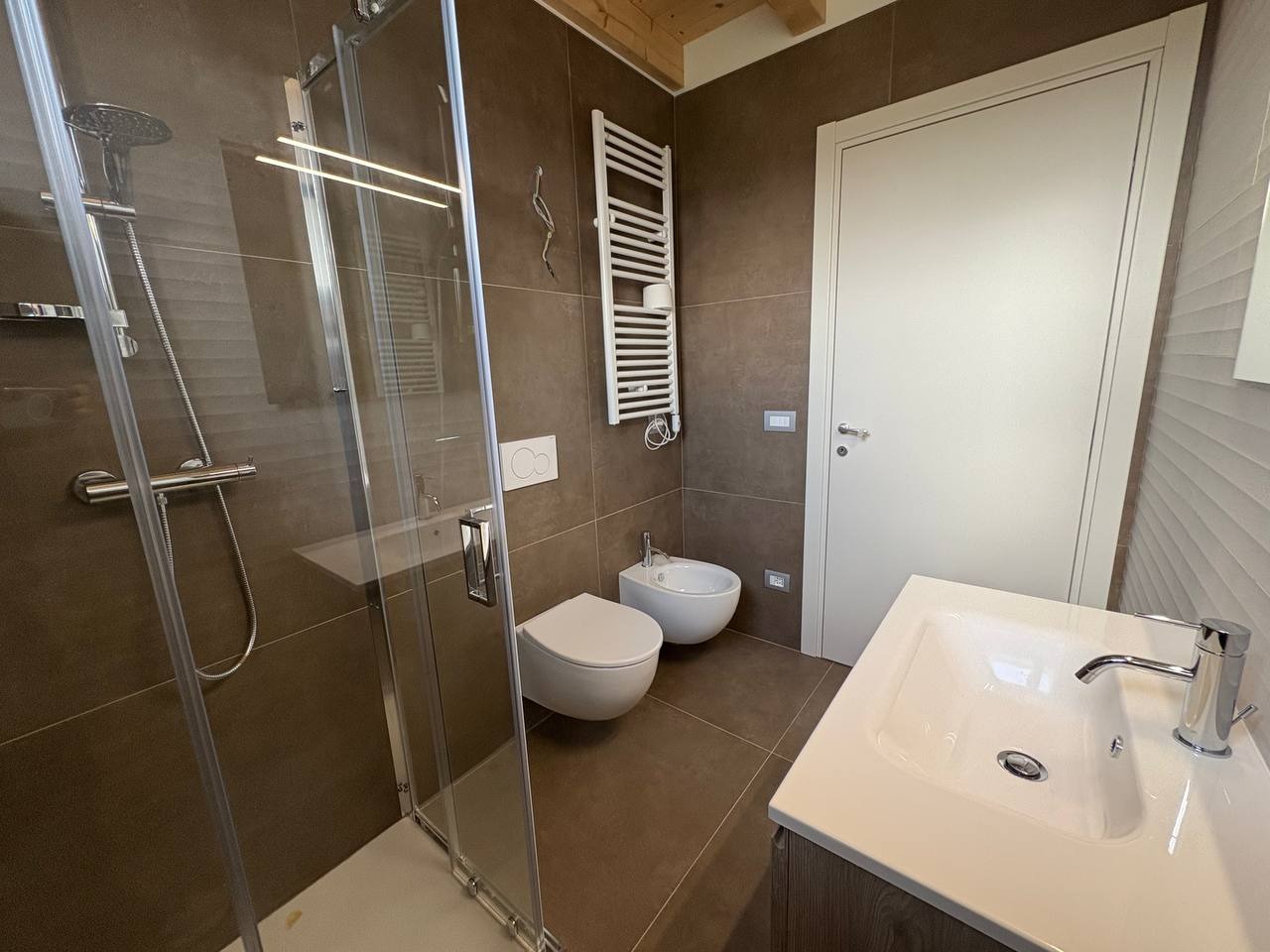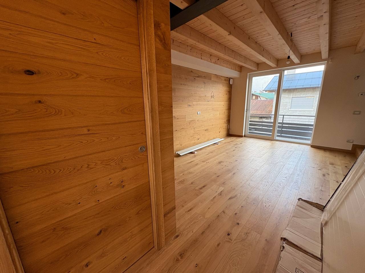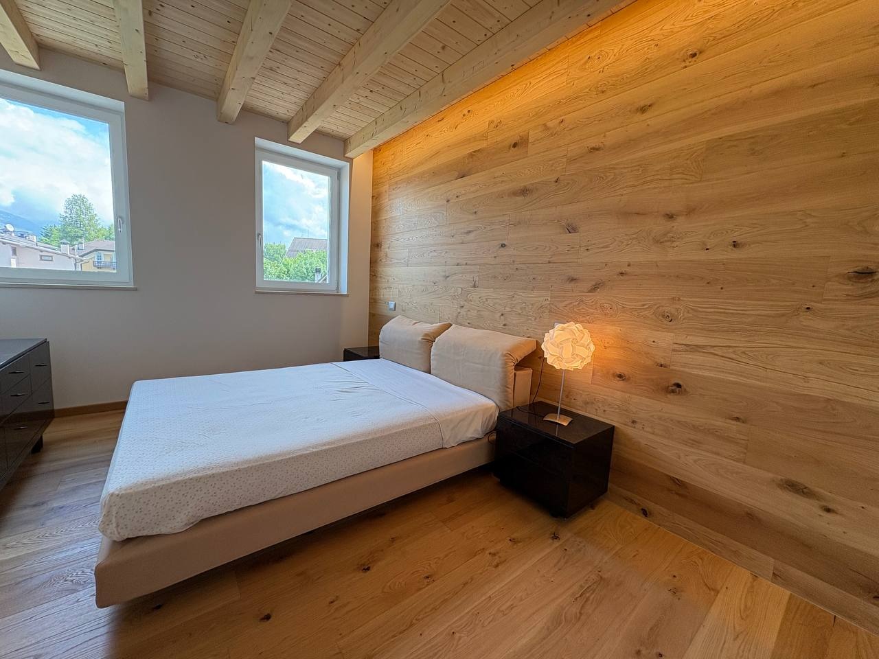 Al livello superiore, nel sottotetto con travi a vista in legno, è presente una terza camera matrimoniale dallo stile caldo e contemporaneo, valorizzata da illuminazione a strisce LED che dona carattere e atmosfera. Questa stanza può essere eventualmente adibita ad un salottino o camera hobby.