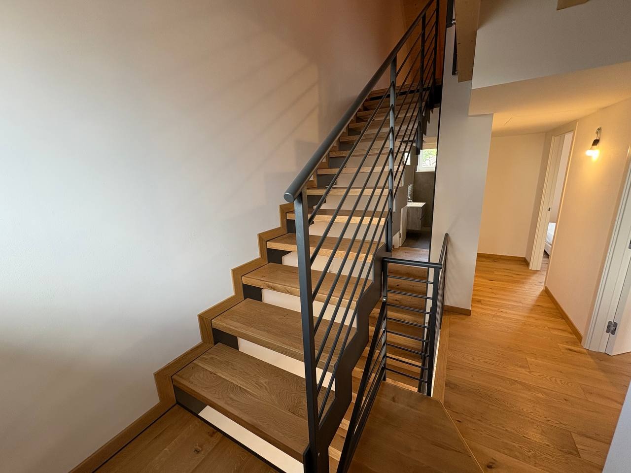 Una scenografica scala in acciaio e legno conduce al piano secondo, dove troviamo due spaziose camere matrimoniali, entrambe servite da un secondo bagno finestrato con box doccia.