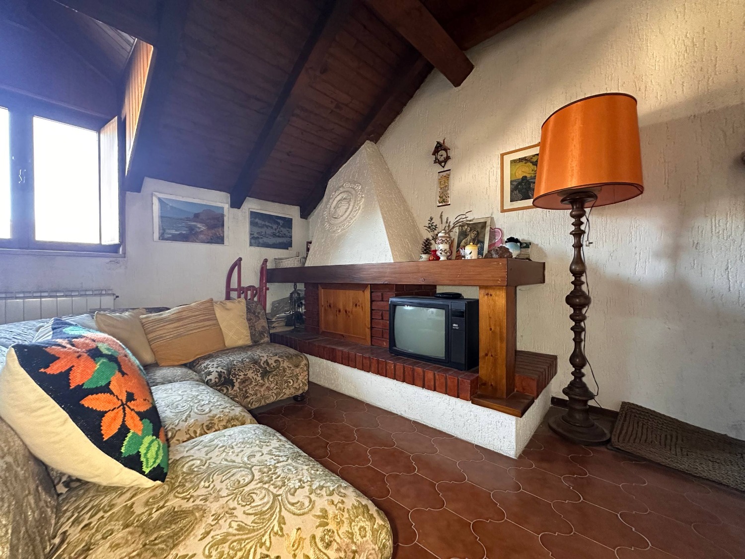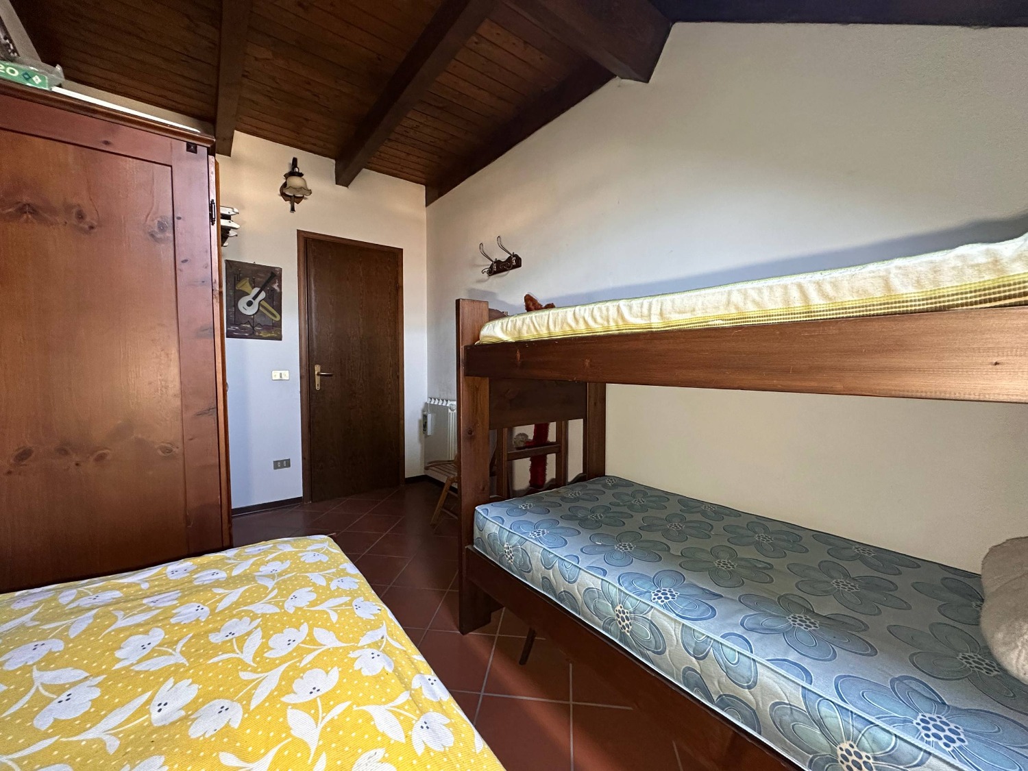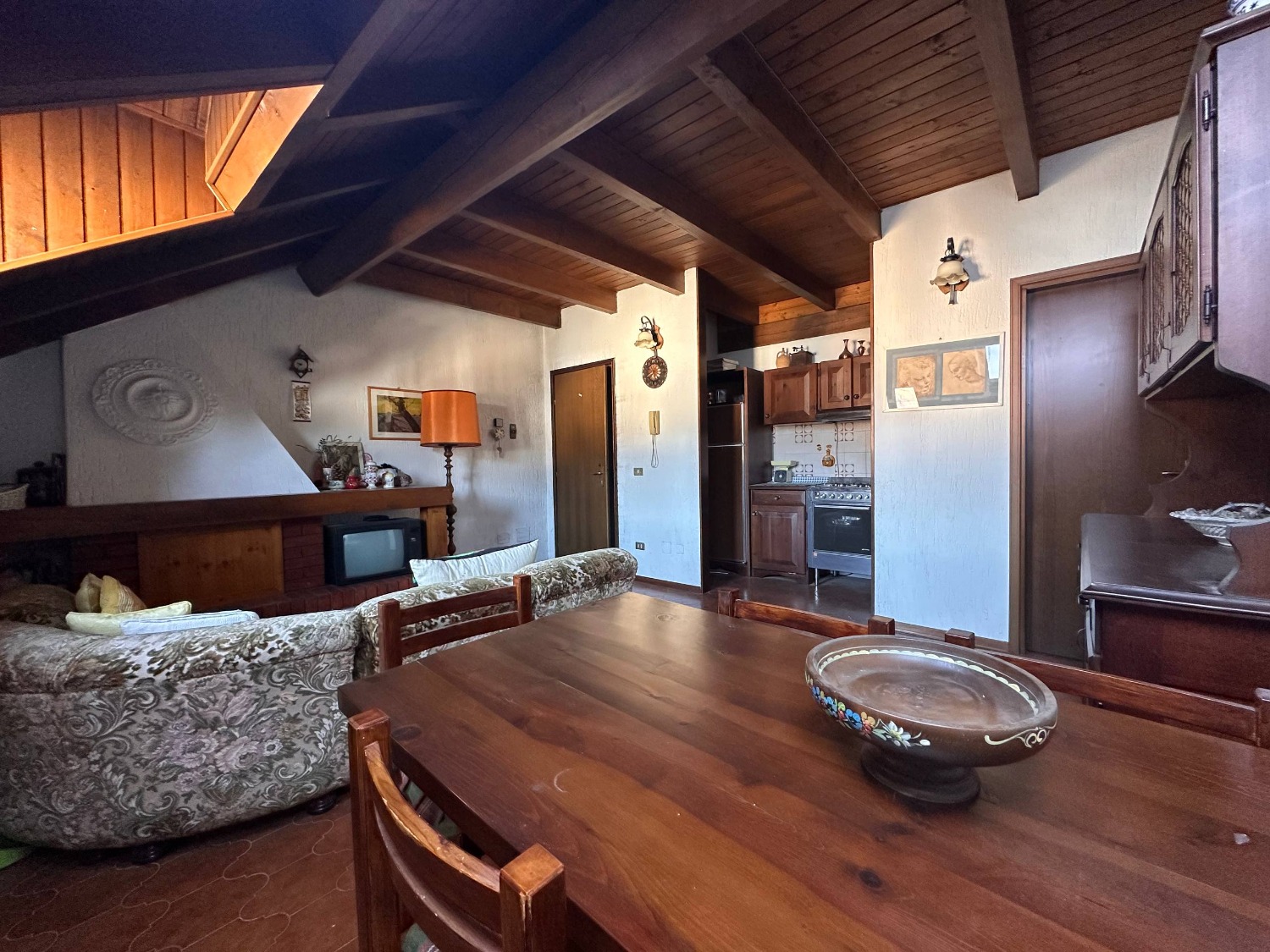 L’immobile si compone da una zona giorno open space con caminetto a legna e cucina semi indipendente, caratterizza per un ampia altezza del soffitto con travi a vista in legno tipiche delle case in montagna.