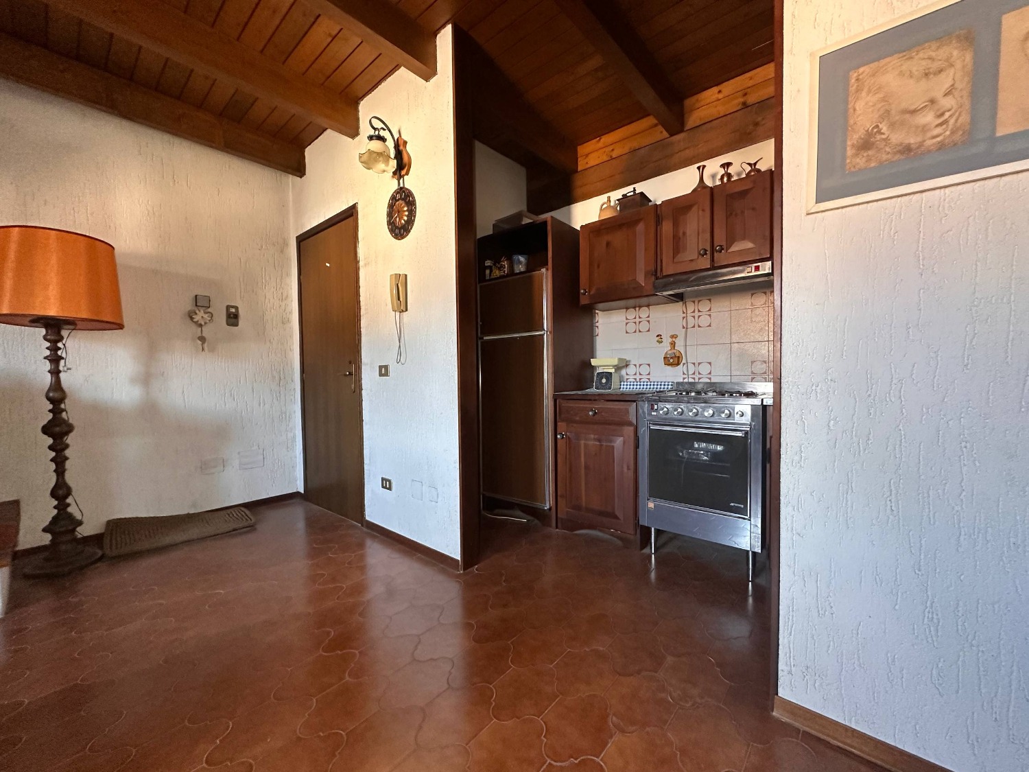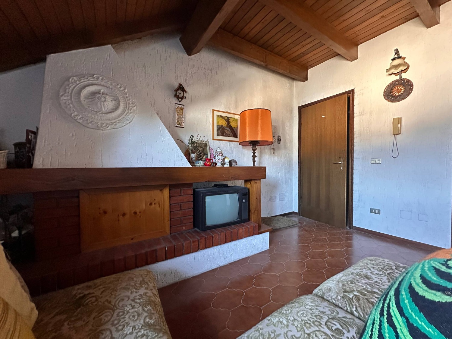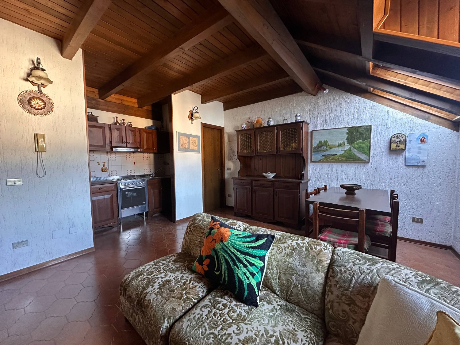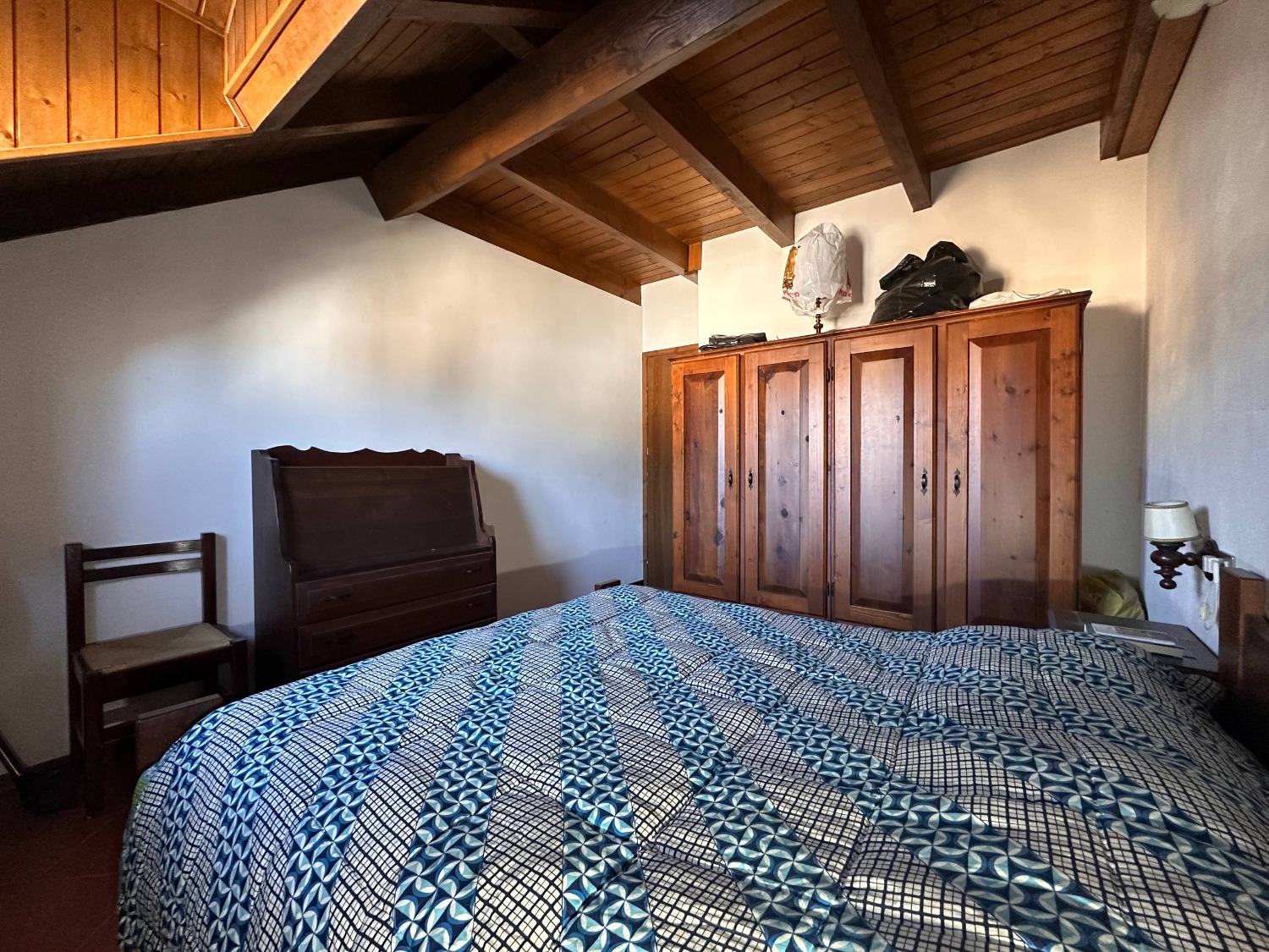 L’immobile si compone da una zona giorno open space con caminetto a legna e cucina semi indipendente, caratterizza per un ampia altezza del soffitto con travi a vista in legno tipiche delle case in montagna.