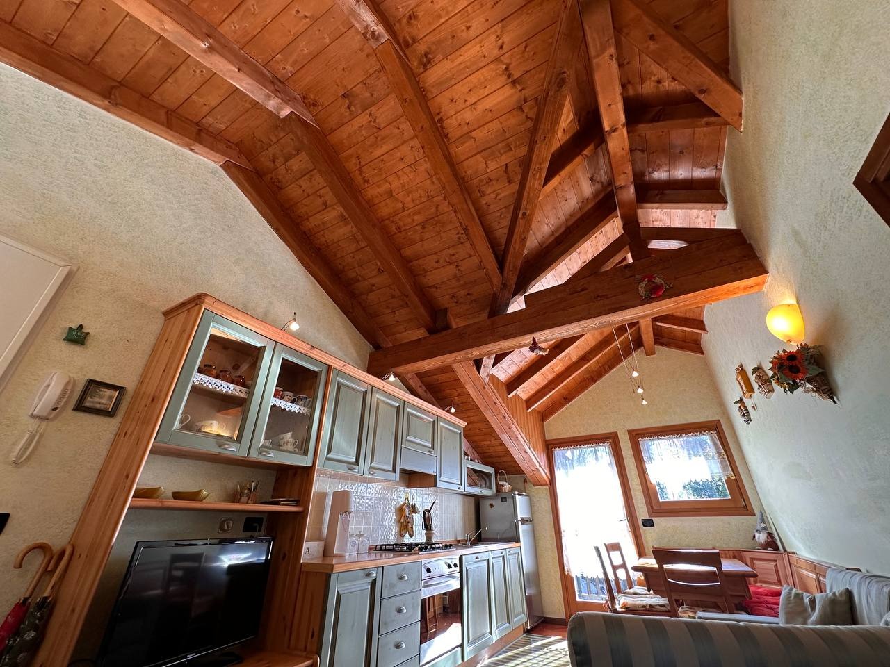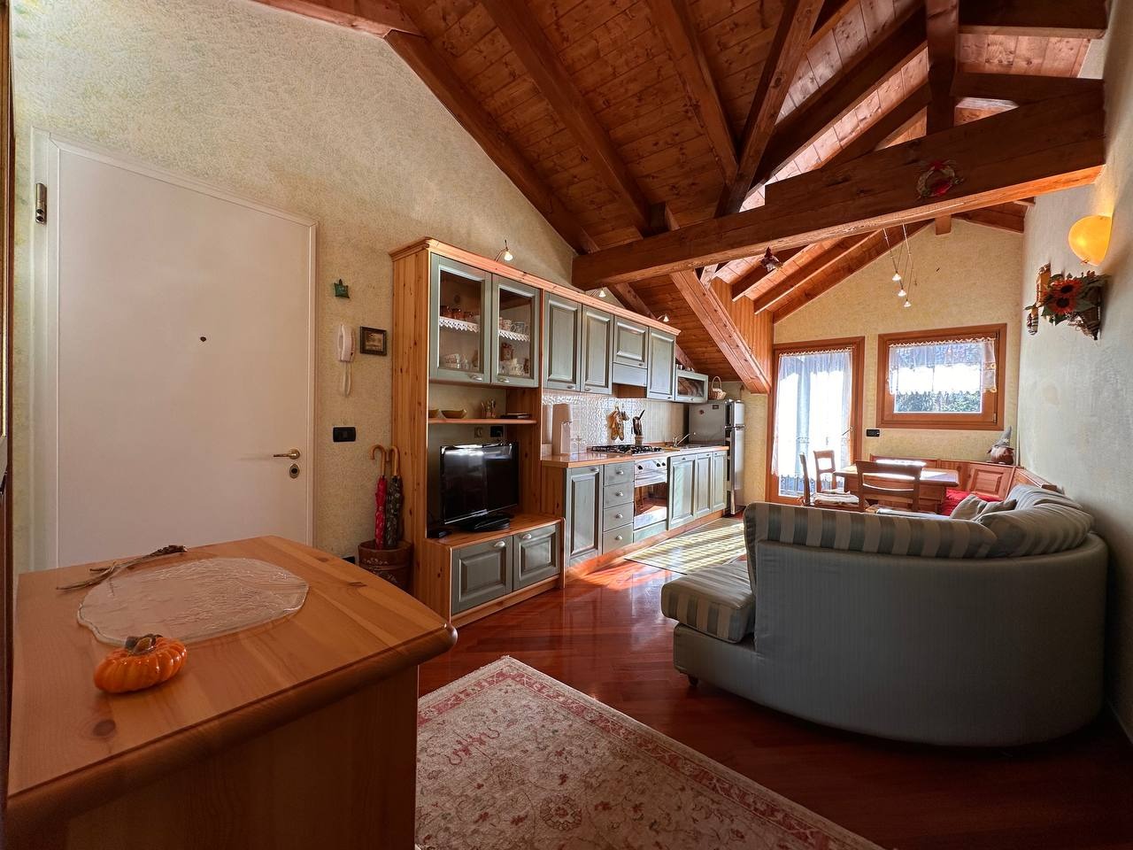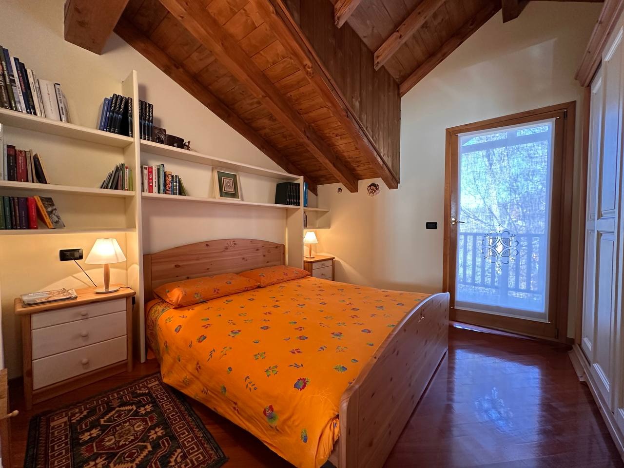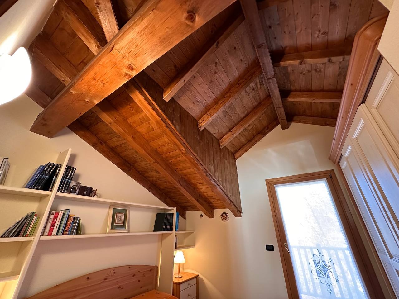Dopo un ingresso indipendente l’immobile si apre su una luminosa zona giorno, impreziosita da un alto soffitto con travi a vista che regala calore e carattere all’ambiente. Da qui si accede a un ampio terrazzo panoramico esposto a sud con vista sulle montagne circostanti.