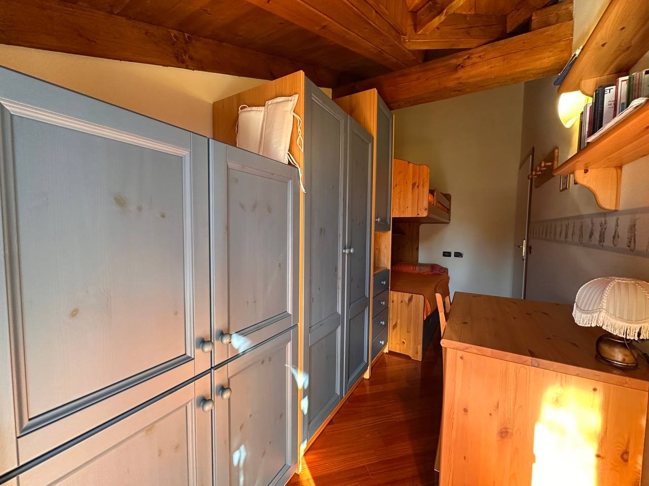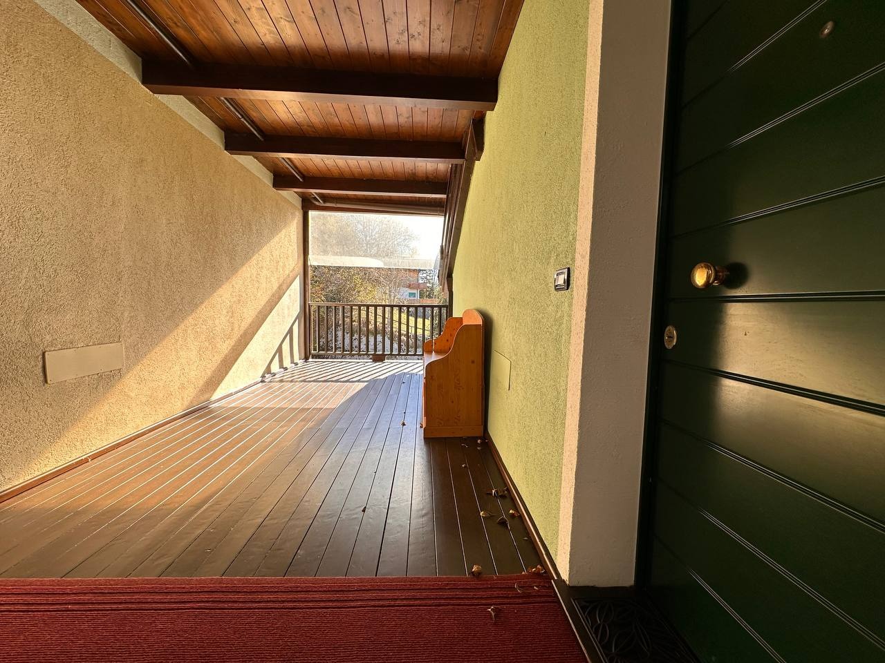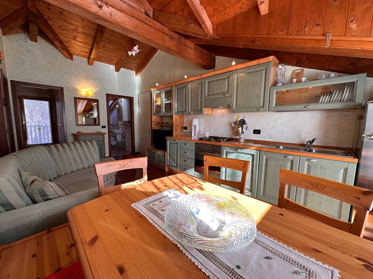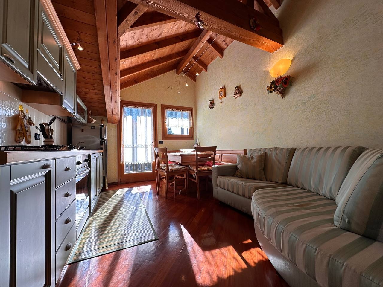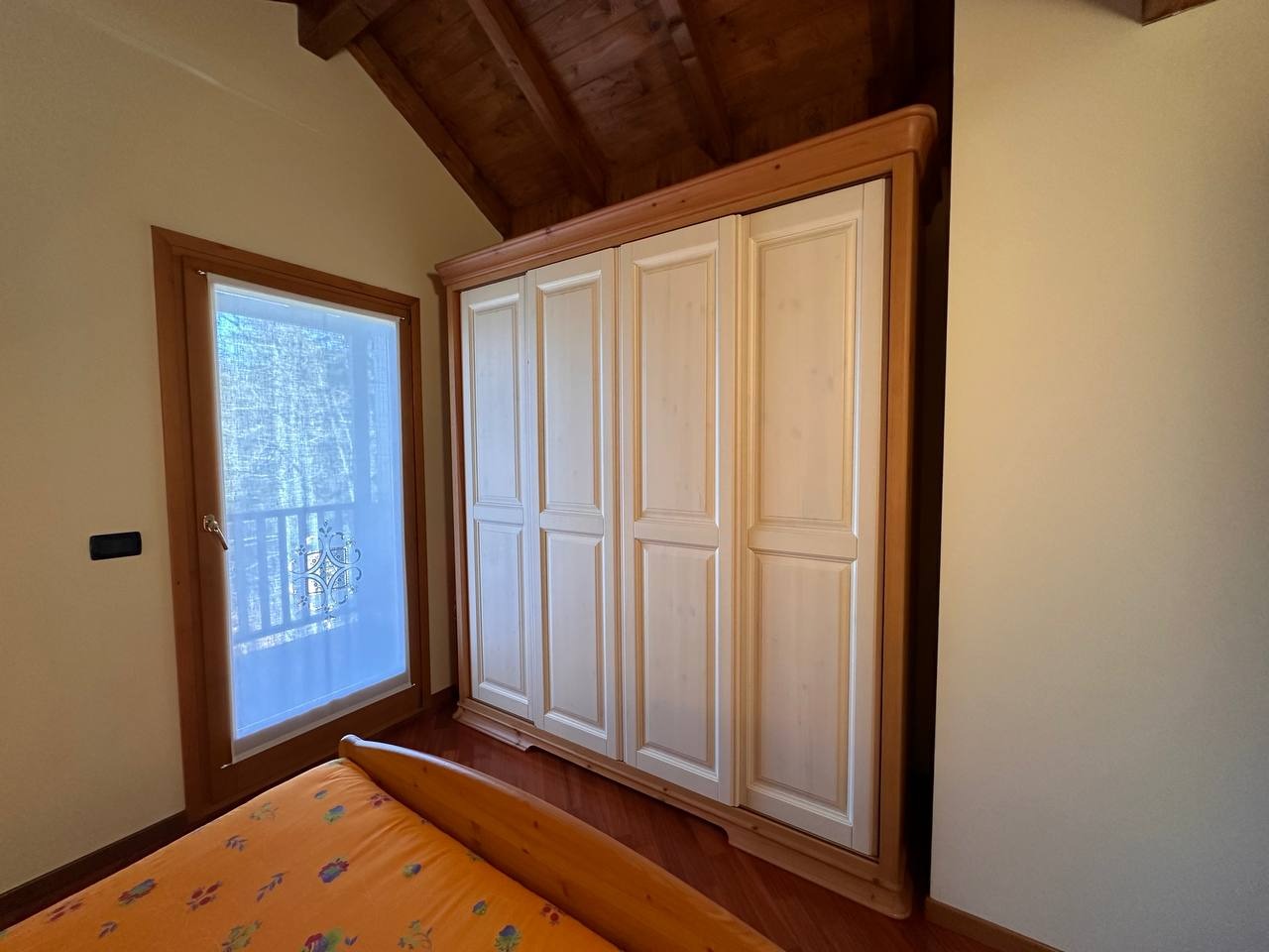 Dopo un ingresso indipendente l’immobile si apre su una luminosa zona giorno, impreziosita da un alto soffitto con travi a vista che regala calore e carattere all’ambiente. Da qui si accede a un ampio terrazzo panoramico esposto a sud con vista sulle montagne circostanti.