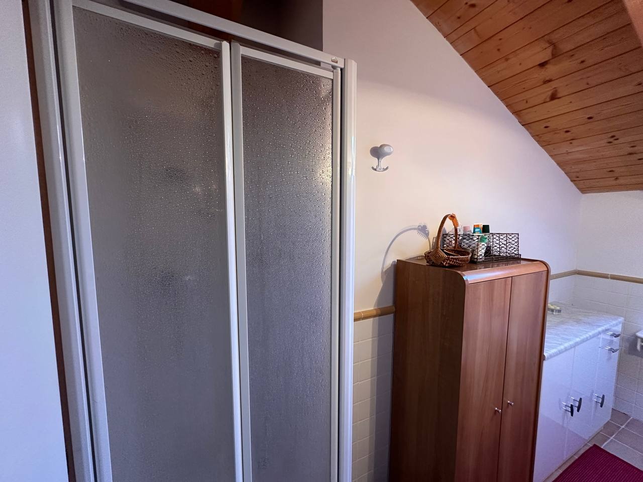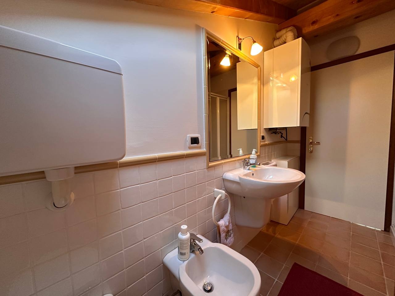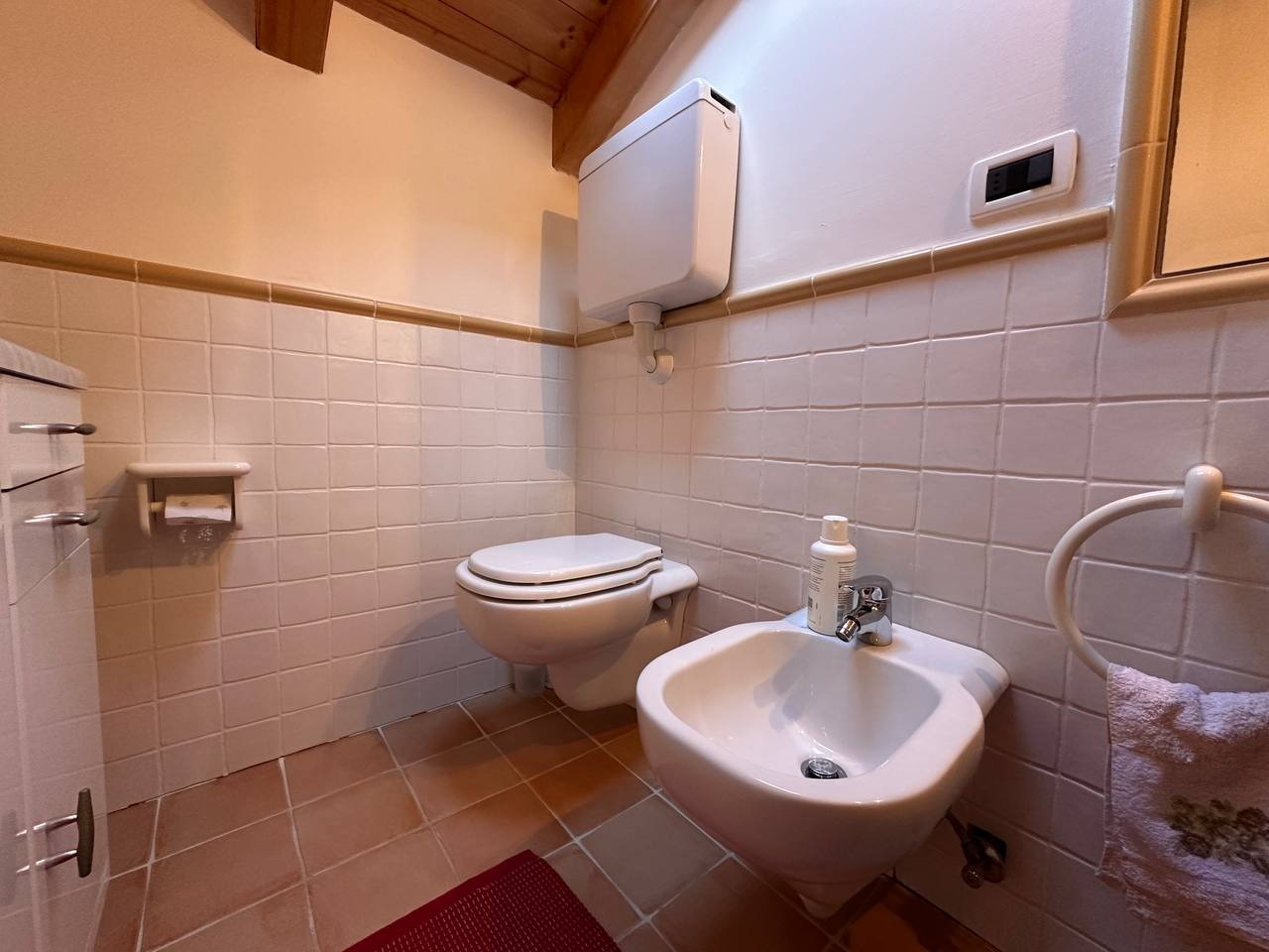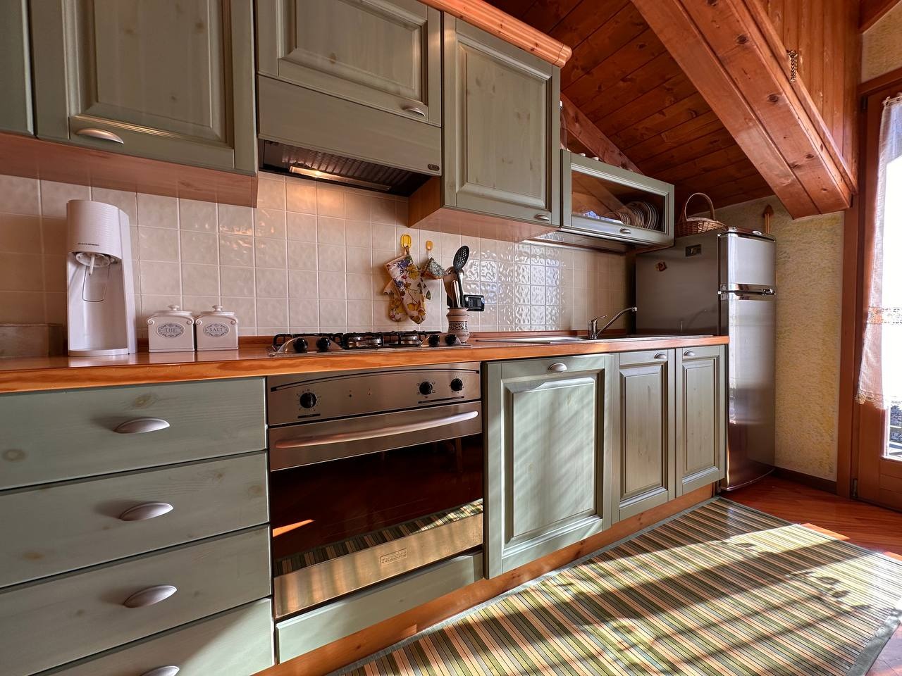 Dopo un ingresso indipendente l’immobile si apre su una luminosa zona giorno, impreziosita da un alto soffitto con travi a vista che regala calore e carattere all’ambiente. Da qui si accede a un ampio terrazzo panoramico esposto a sud con vista sulle montagne circostanti.