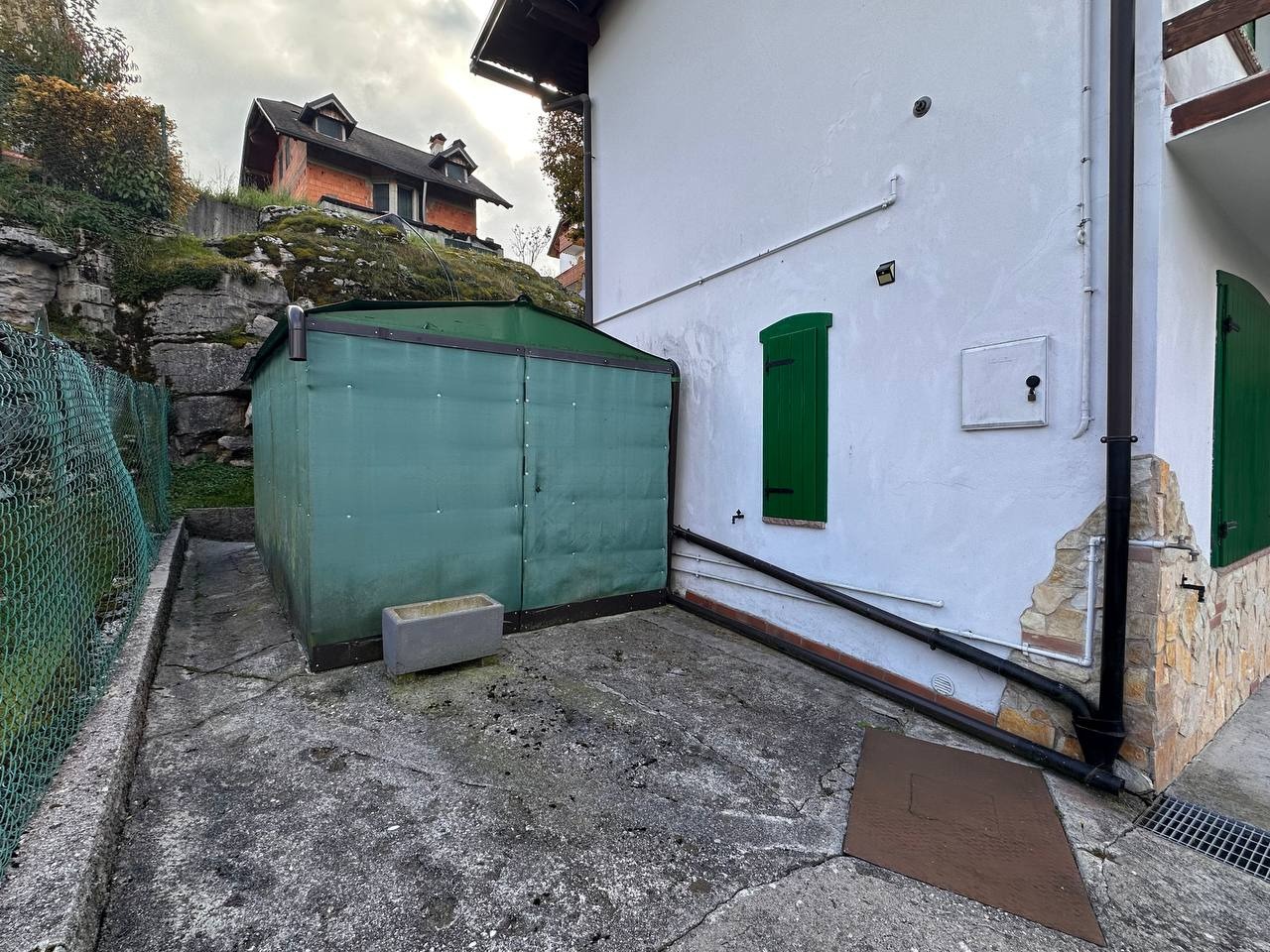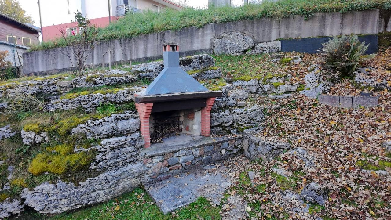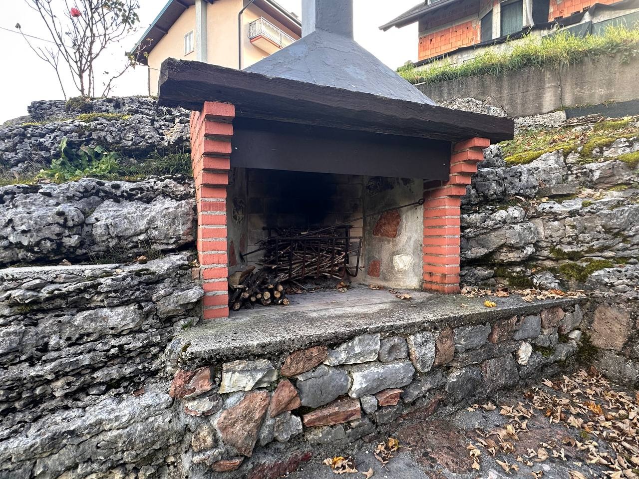 All’esterno: posto auto, locale ripostiglio e ampio giardino verde in comune con caminetto e tavolo per pranzi all’aperto.