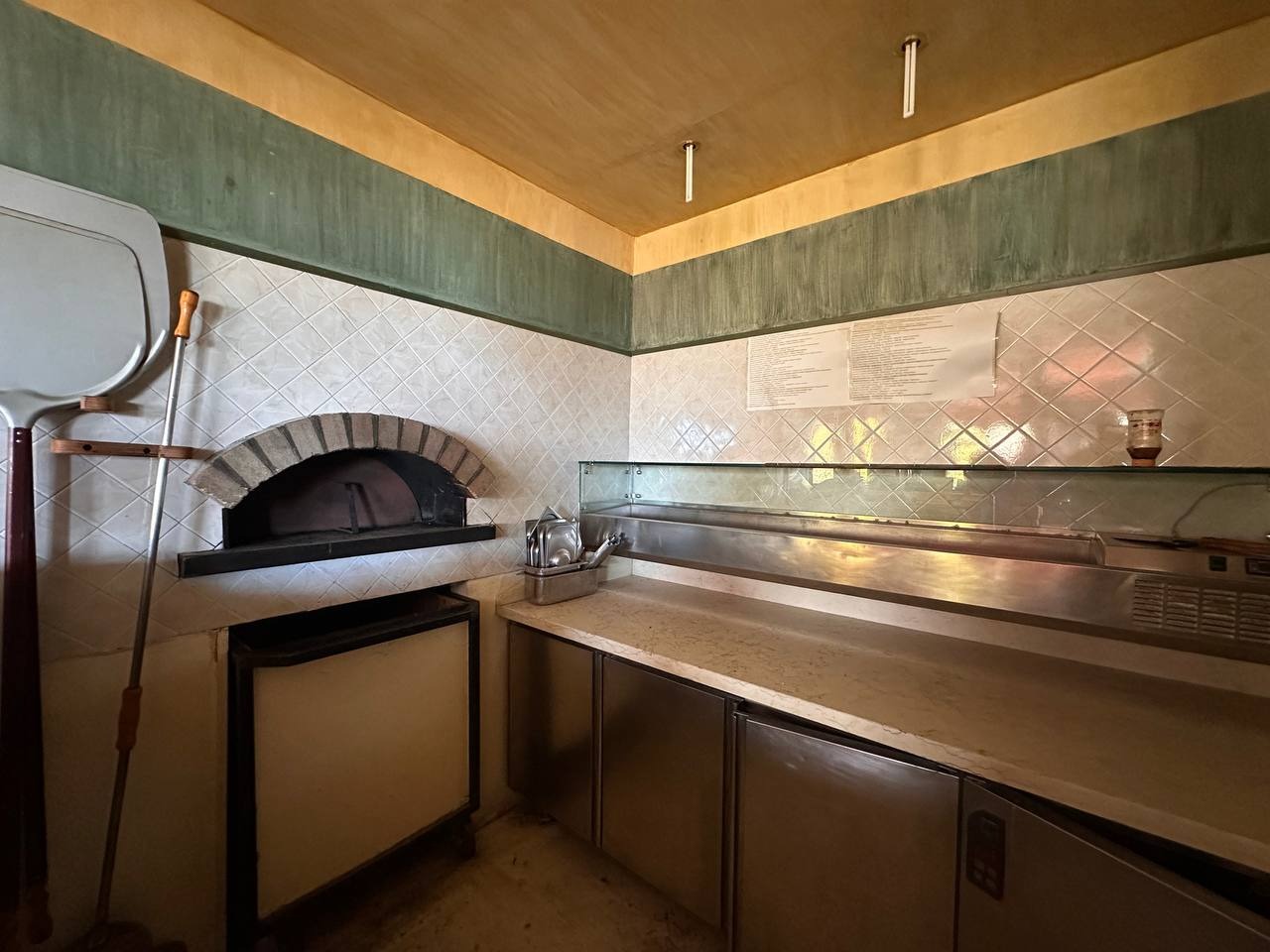 Il locale è dotato di banco pizzeria con forno a legna, ampia cucina attrezzata con comodi disbrighi e ripostigli, e un lungo bancone bar ideale per la preparazione di bibite e cocktail. È inoltre presente un ingresso separato con camerino, utile per il personale o per eventuali artisti in occasione di serate musicali. L’impianto audio e luci è già installato e funzionante, così come il sistema di ventilazione interna.